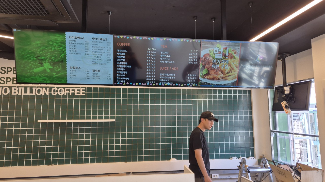 설치형 사이니지/카페/서울시 백억커피 상봉점 – 천장형 디지털메뉴보드 설치 사례