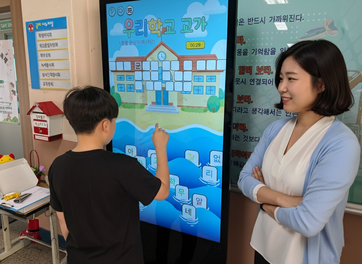 설치된 디스플레이는 대형 DID 모니터 기반으로, 터치 조작이 가능해 학생들이 손쉽게 이용할 수 있습니다. 사진에서도 볼 수 있듯이 학생들은 교가 맞추기, 퀴즈 게임 등 학습과 놀이가 결합된 콘텐츠를 자연스럽게 체험하며, 교사 역시 학생과 함께 교육적 활동을 진행할 수 있습니다. 이처럼 학교 무인안내 시스템은 단순한 정보 전달을 넘어 학생 참여형 학습 플랫폼으로 기능하며, 교내 소통과 교육의 질을 한층 향상시킵니다.