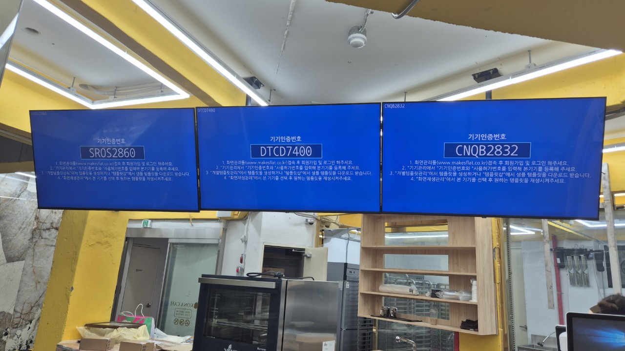 세 대의 DID 모니터가 일렬로 연결되어 설치되었으며, 메뉴뿐 아니라 이미지와 영상 콘텐츠를 함께 송출할 수 있어 고객 경험을 한층 풍부하게 만듭니다.