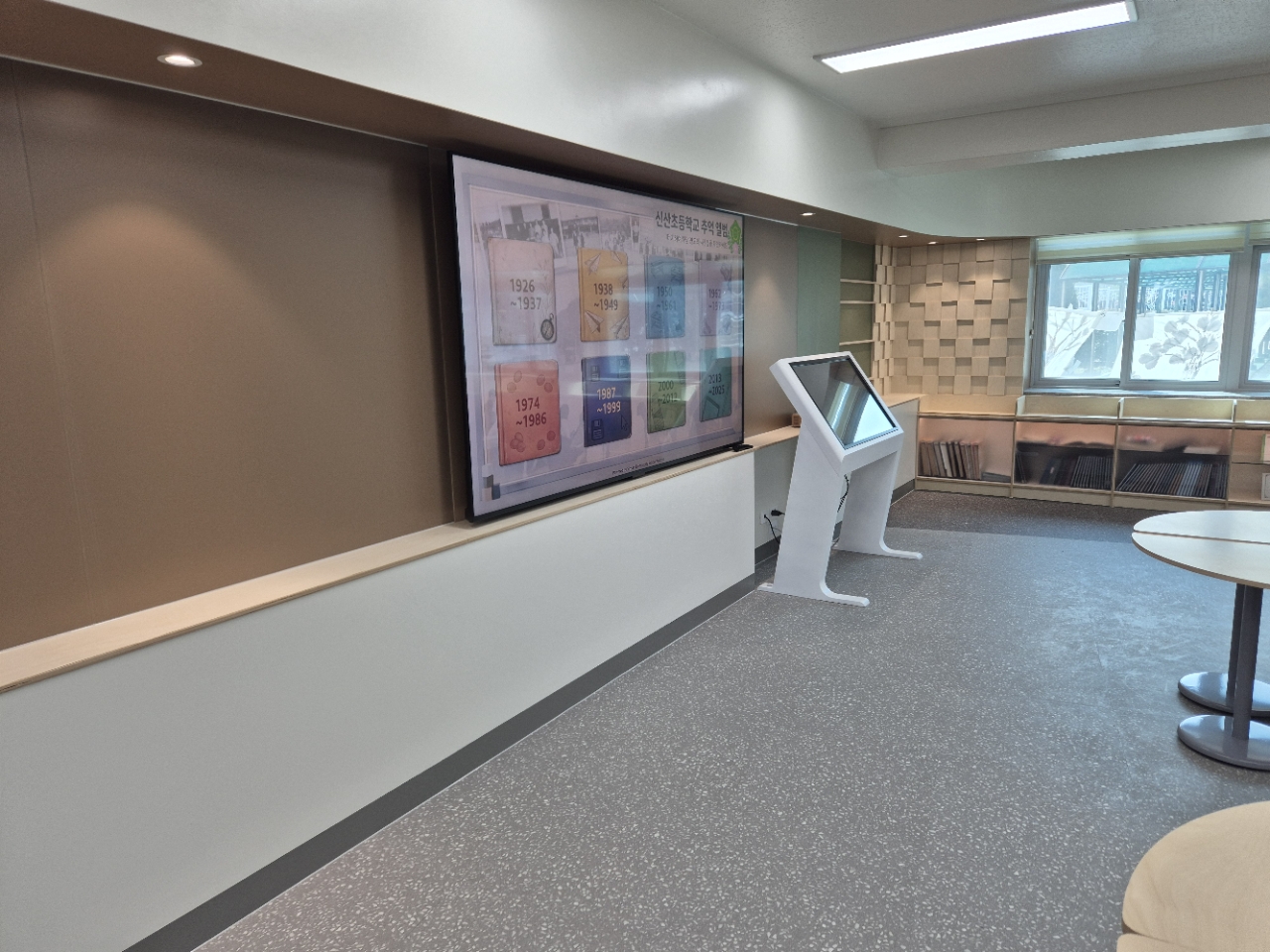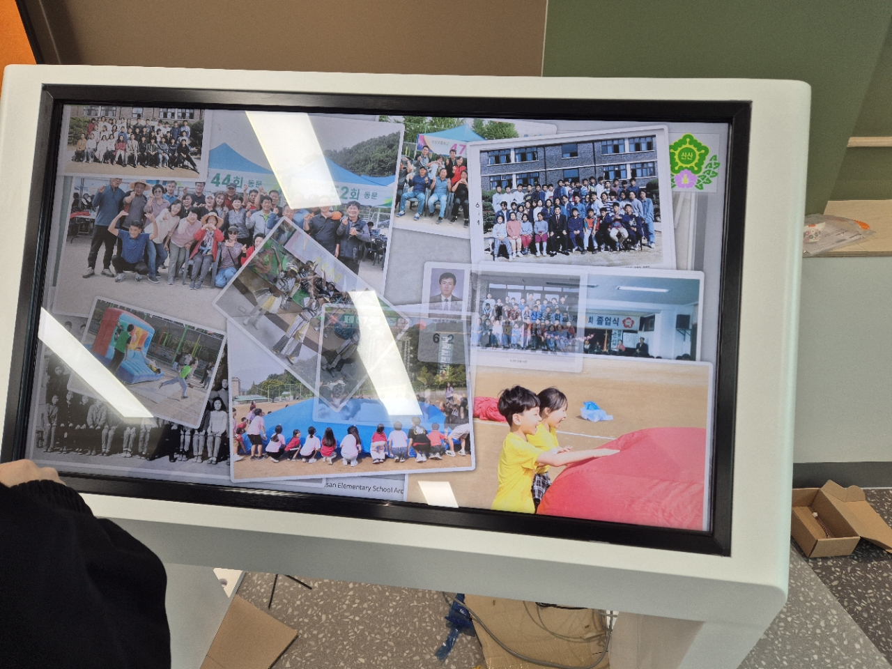 파주 신산초등학교 100주년 기념관 43인치 가로형 터치 키오스크 설치 사례 (추억 앨범·대형 모니터 연동)