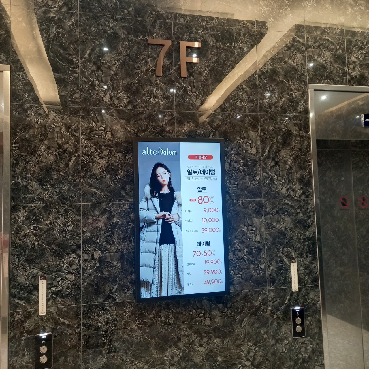 NC백화점 대전유성점 전체층의 엘리베이터 외부에 백화점 상품 및 행사안내용 전자광고판을 설치하였습니다.