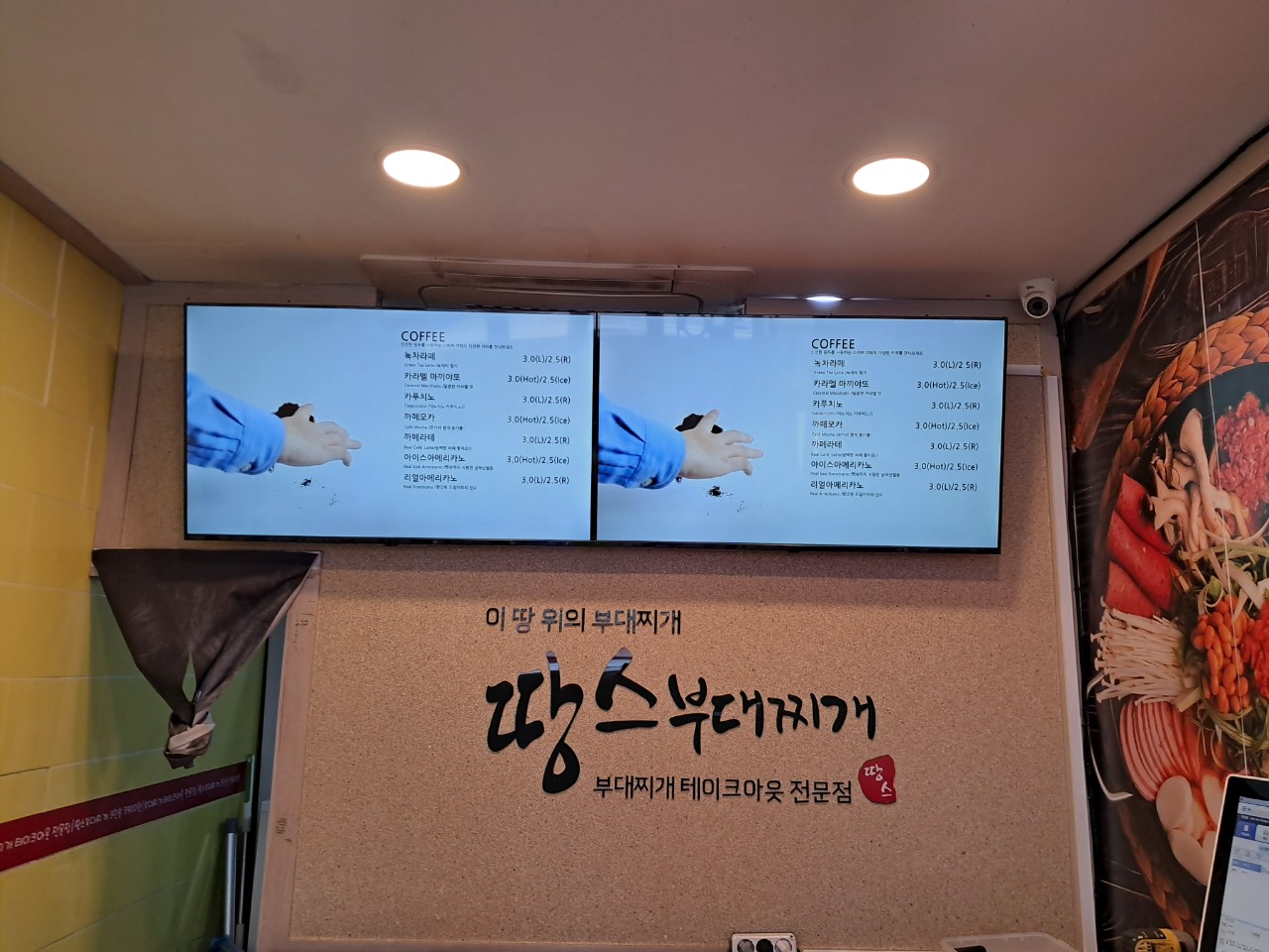 설치된 메뉴판은 매장 인테리어와 조화를 이루는 벽부형 형태로 깔끔하게 시공되었으며, 고객 동선과 시야를 고려한 최적의 위치에 배치되었습니다. 실제 화면에서는 커피류와 다양한 사이드 메뉴까지 표시되어, 부대찌개 이외의 메뉴 선택을 자연스럽게 유도합니다.