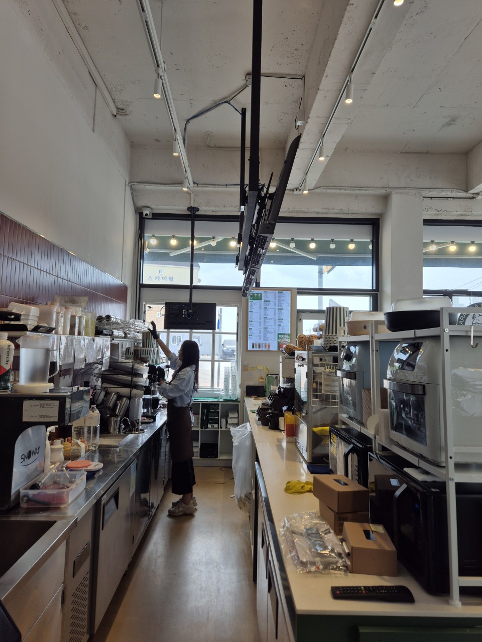 백억커피 영종하늘도시점에 스마트플랫의 천장형 디지털메뉴보드가 설치되었습니다. 이번 설치는 매장 특성을 고려하여 바리스타 작업 공간 위쪽에 메뉴보드를 배치함으로써, 고객이 매장 어디에서든 직관적으로 메뉴를 확인할 수 있도록 구성되었습니다.