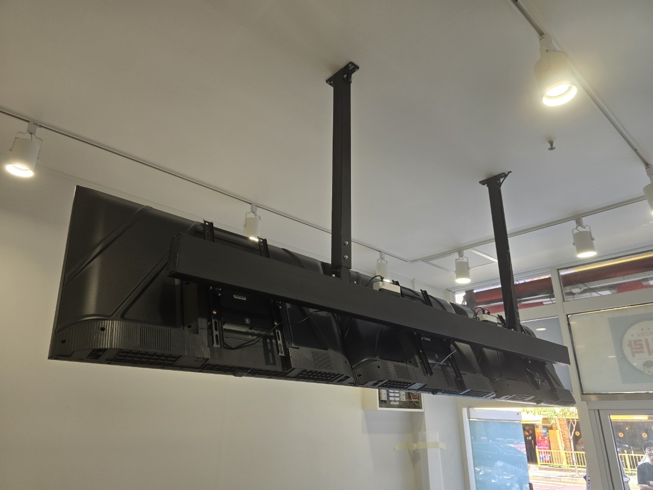 이번에 설치된 장비는 스마트플랫 DID 3대를 활용한 멀티비전 형태의 천장 매립형 메뉴보드입니다. 천장에서 직하형으로 내려오는 구조를 적용하여, 고객이 주문대에서 자연스럽게 시선을 올리면 메뉴가 한눈에 들어오도록 설계되었습니다. 특히 3대의 디스플레이를 일렬로 구성해, 메뉴 카테고리별 분류가 직관적이며 시인성이 뛰어납니다.