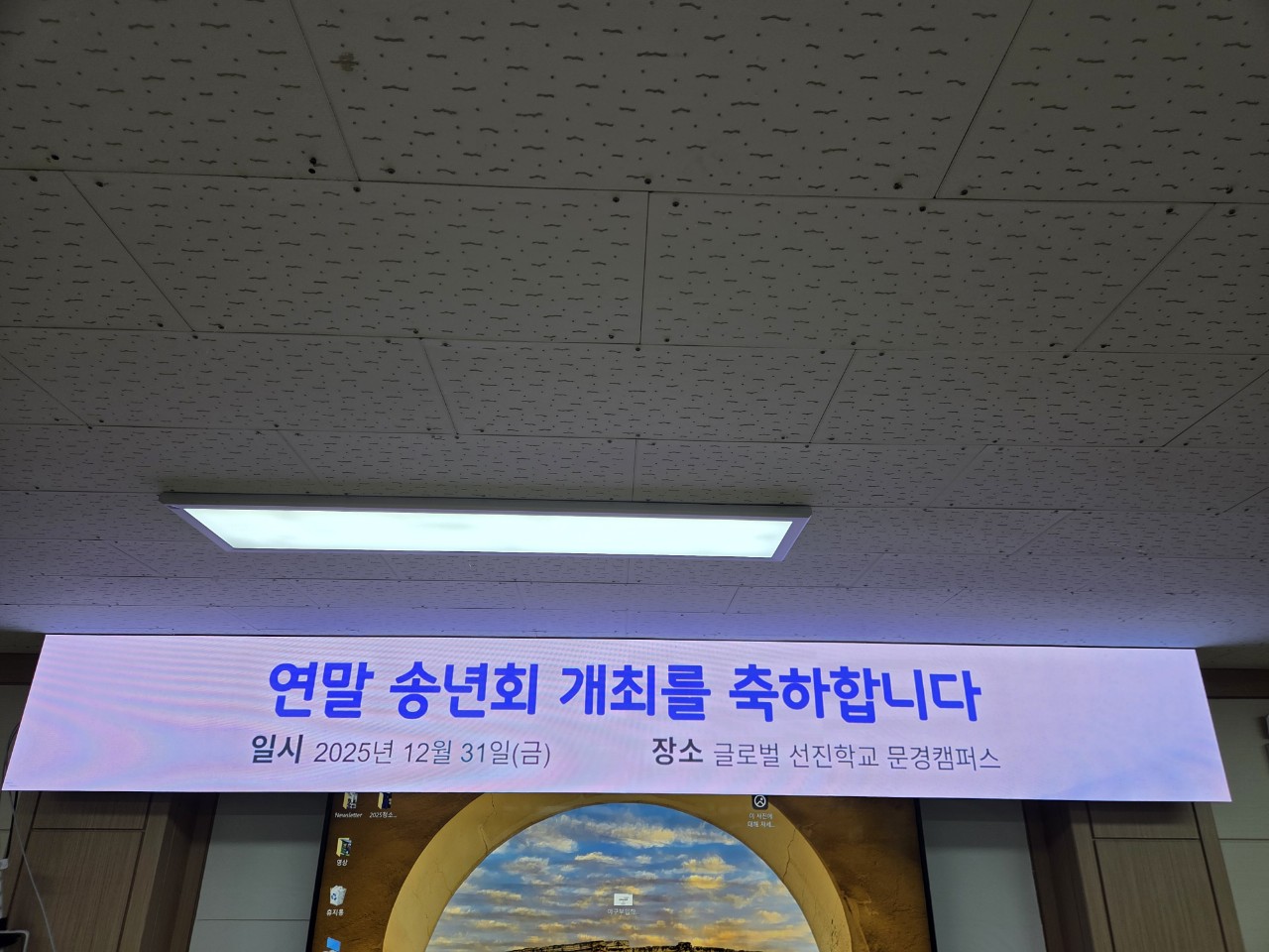이번 현장은 문경에 위치한 글로벌선진학교 문경캠퍼스로, 실내 벽면 상단에 **P1.86 LED 전자현수막(가로 3,840mm × 세로 480mm)**을 설치했습니다. 사진처럼 연말 송년회 안내 문구처럼 날짜와 장소를 명확히 보여주는 공지에 적합하며, 화면이 길게 뻗는 전자현수막 형태라 복도·출입 동선에서 자연스럽게 시선이 닿아 정보 전달 누락을 줄이는 데 도움이 됩니다.