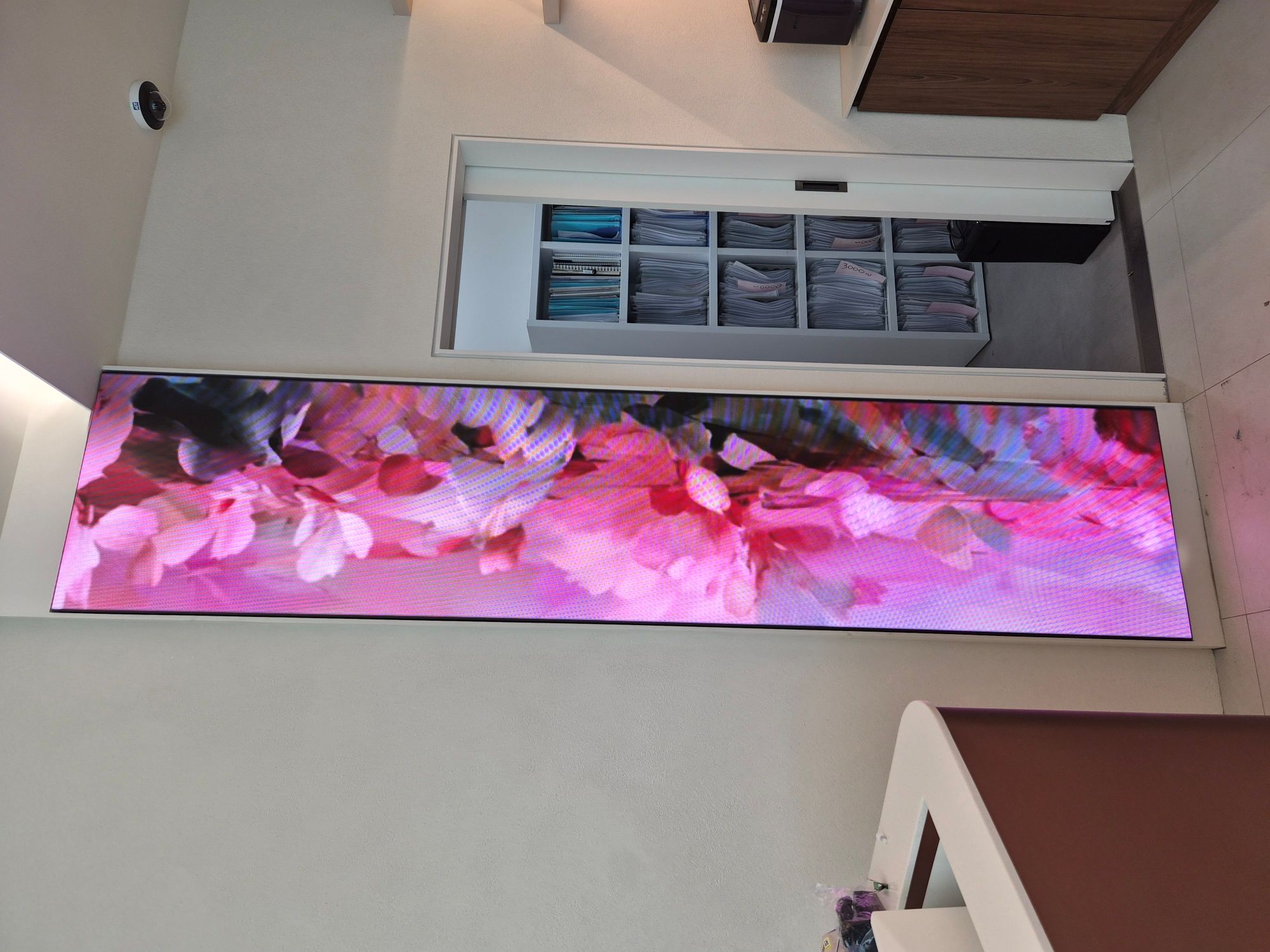 이번 설치의 핵심은 좁고 긴 벽면에 맞는 형상 설계와 함께, P1.86 고해상도 픽셀피치를 적용해 근거리 시청 환경에서도 화면 디테일을 안정적으로 표현할 수 있도록 한 점입니다. 병원 로비는 고객이 가까운 거리에서 화면을 접하는 공간이기 때문에, 꽃·자연·브랜드 무드 영상처럼 색감과 질감이 중요한 콘텐츠의 표현력이 매우 중요합니다. P1.86급 LED는 이러한 환경에서 세로형 미디어월을 보다 고급스럽고 정돈된 느낌으로 연출하는 데 유리합니다.